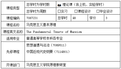 本课程为全校本科各专业公共必修课,是思想政治理论课主干课程、基础课程。通过本课程的学习,使学生系统掌握马克思主义哲学、马克思主义政治经济学、科学社会主义基本原理,树立正确的马克思主义观;帮助学生学会运用马克思主义立场观点方法分析问题和解决问题,正确认识世界的本质和人类社会发展规律,明确社会主义取代资本主义的历史必然性,坚定共产主义理想信念。