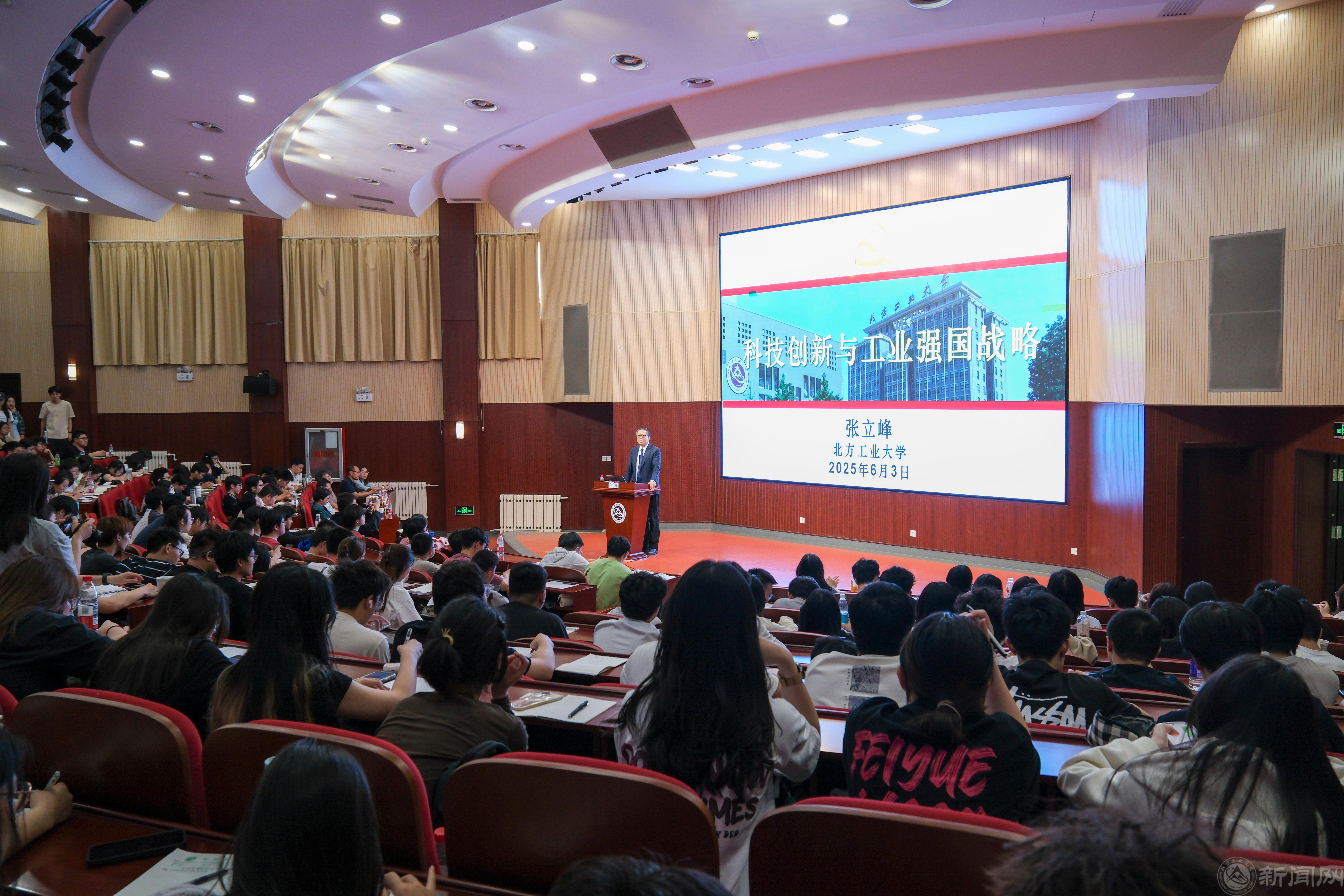 随后,张立峰聚焦中国百年钢铁工业发展史,以大量的数据和珍贵史料为依托,深入剖析中国经济崛起与工业发展之间的紧密联系。他指出,高校作为科技创新的前沿阵地,是科技高速发展的强劲发动机,更是攻克“卡脖子”难题的“主战场”。在建设科技强国的征程中,人才是第一资源,必须坚定不移地走基础研究人才自主培养之路,为国家的科技发展筑牢坚实的人才根基。他希望师生传承弘扬“兴工报国”传统,胸怀“国之大者”,将科学研究的重心放在硬核科技上,以青春之我、奋斗之我,为科技强国建设贡献北方工大力量。