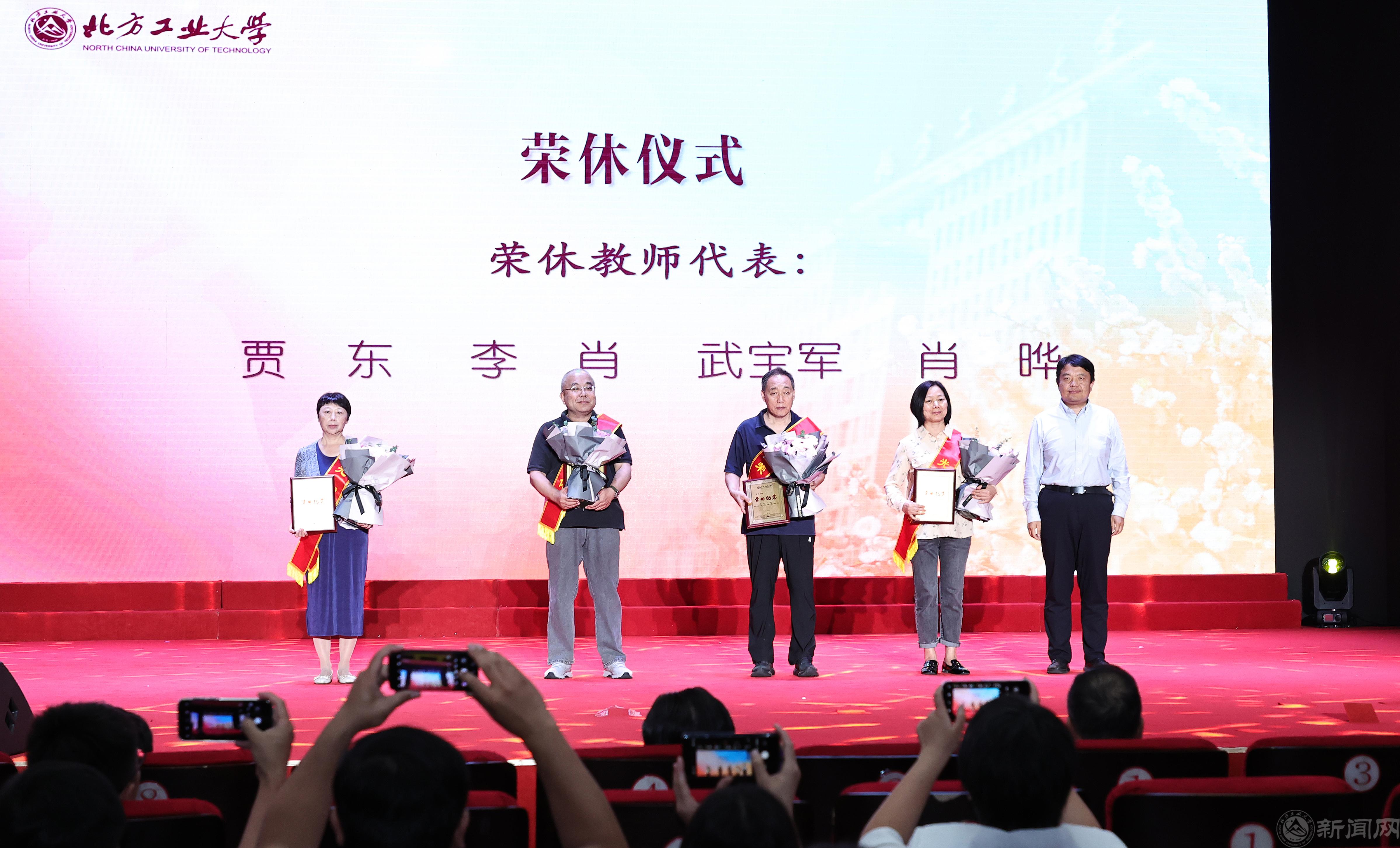 党委常委、副校长陈群为荣休教师颁发奖牌,新教师为荣休教师献花
